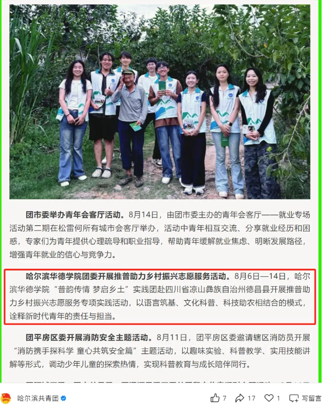 近日,哈尔滨共青团公众号专题《一周盘点》报道了哈尔滨华德学院“普韵传情 梦启乡土”暑期三下乡社会实践团赴四川凉山彝族自治州德昌县开展推普助力乡村振兴志愿服务,以语言筑基、文化科普、科技助农结合模式诠释新时代青年担当。据悉,此次报道为本年度团市委唯一刊登的高校共青团工作;实践团已成功入选2025年“推普助力乡村振兴”全国大学生暑期社会实践志愿服务活动参与协同团队名单,为黑龙江省内唯一入选的民办本科高校团队;同时我校也已连续三年获评黑龙江省暑期“三下乡”社会实践重点单位,并累计获得社会实践类市级以上奖项500余项。