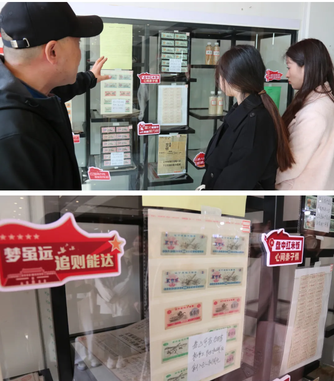 在物品展柜中还摆放有承载着老一辈记忆的粮票、副食品券,吸引师生驻足观看。