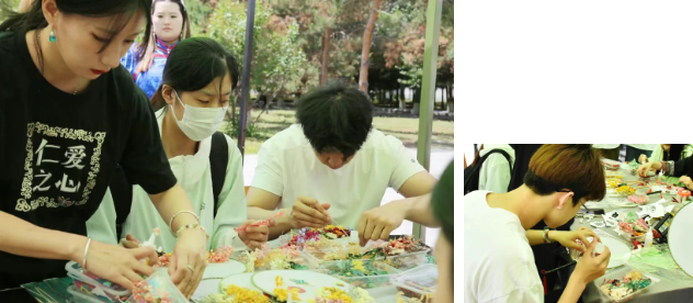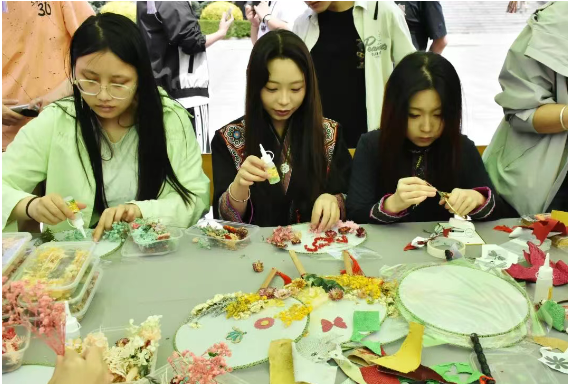 赫哲族鱼皮画区同样人气爆棚,“艺媒匠心”团队成员向大家介绍了鱼皮画悠久的历史和独特的制作流程,随后为大家提供了半成品材料,师生们在体验拼接、粘贴的过程中,亲手制作出了一件件独特的鱼皮画校庆纪念品,深刻感受到了非遗文化的魅力。