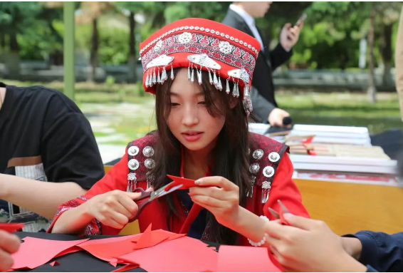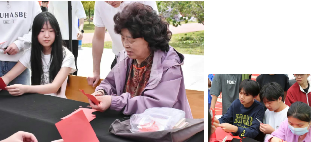 非遗工坊互动环节更是将活动推向高潮。在满族剪纸区,剪纸艺术第三代非物质文化遗产代表性传承人于宏老师亲临现场,详细讲解了剪纸文化背后的寓意以及剪纸技巧。在她的悉心指导下,师生们纷纷动手制作校庆主题或民族元素的剪纸作品,完成后还可将作品带走留念,现场充满了欢声笑语和对传统文化的热爱之情。