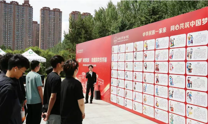 活动伊始,师生们通过精心制作的“中华民族一家亲 同心共筑中国梦”图文展板,深入了解中华 56 个民族的风土人情、文化特色等知识。哈尔滨华德学院“石榴籽”实践坊副队长李俊龙热情洋溢地讲解,让在场师生对民族知识有了更深入的了解,增进了对民族文化的认同感。