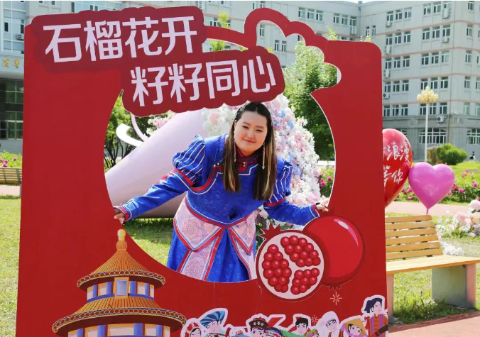民族服装服饰体验打卡区也是热闹非凡。活动现场设置了民族服装体验点,提供了丰富多彩的少数民族特色服装,实践坊的学生们热情地协助师生穿戴,并搭配上精美的头饰、配饰,让参与者仿佛置身于少数民族的风情之中。随后,师生们穿着民族服装来到“石榴花开”“民族团结柱”主题雕塑打卡点,纷纷拍照打卡,留下了一张张充满民族风情与校庆喜悦的照片,成为了校园内一道亮丽的风景线。