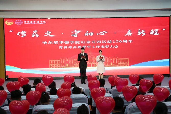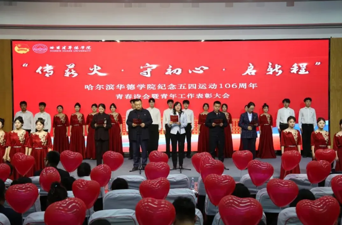时代各有不同,青春一脉相承。5月9日,哈尔滨华德学院纪念五四运动106周年“传薪火·守初心·启新程”青春诗会暨青年工作表彰大会在图书馆学术报告厅举行。哈尔滨华德学院党委书记、政府督导专员宋烨,校长李长威,副校长李斌,副校长张艳,校长助理魏可霏出席大会,党委组织部、党委宣传部、党委学生工作部、团委、马克思主义学院主要负责同志,各学院党总支负责同志、团总支书记、全体学生工作者、马克思主义学院全体教师和青年学生代表参加大会。