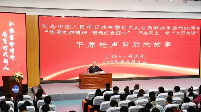 为纪念中国人民抗日战争暨世界反法西斯战争胜利80周年,5月8日,哈尔滨华德学院以“传承英烈精神 锻造红色匠心”为主题, 开展师生同上一堂“大思政课”活动。学校特邀校外辅导员、原武警哈尔滨指挥学校副校长、《平原枪声背后的故事》作者孙凤来作为主讲嘉宾,为近400名师生开展主题思政课讲座。
