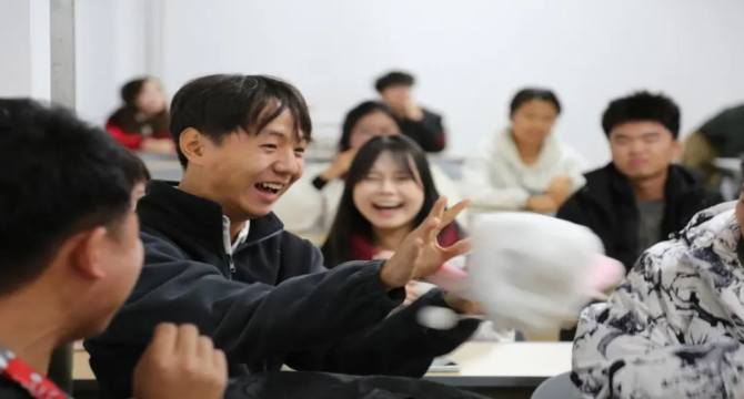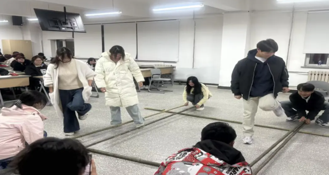 “竹竿舞”环节,来自不同民族的同学纷纷加入,在欢快的竹竿开合声中感受民族文化的独特魅力;“提竹竿”挑战中,各组队员默契配合,用一根手指共同托起竹竿;“你画我猜”环节,成员们围绕“民族团结”“民族节日”“民族美食”等主题展开互动,互动不仅考验着彼此的默契,更在轻松氛围中加深了对不同民族文化的了解,让教室始终充满欢声笑语与团结温情。