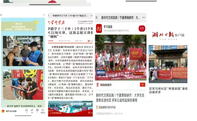 据统计,在2024年度暑期“三下乡”社会实践活动中,我校共组建社会实践团队校级重点团队28支,院级团队338支,同时结合“返家乡”社会实践系列特色项目,共计3500余名学生参与到本次暑期社会实践活动中,形成了一支规模庞大、充满活力的青年志愿服务大军。期间,各实践团队发挥专业优势,积极开展“七彩假期”、“乡村振兴”等特色专题行动,实践范围覆盖省内外60余个地区,各类媒体报道篇数70余篇,总浏览量突破10万人次,收获了各级单位表扬信100余封,被中国青年网、大学生云报、澎湃新闻等多家主流媒体转载报道,包括学习强国、人民日报平台等。达到了预期的实践效果,取得了良好的社会反响。