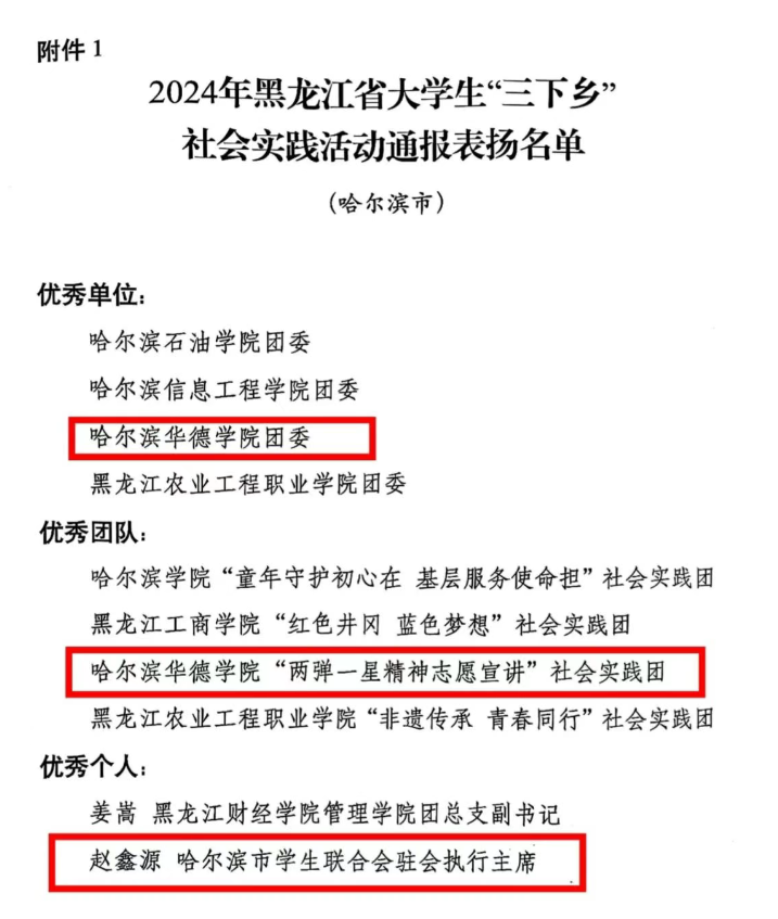 近日,共青团黑龙江省委员会发布2024年黑龙江省大学生“三下乡”社会实践活动通报表扬名单。在此份名单中,我校团委凭借出色表现再获黑龙江省大学生“三下乡”社会实践活动“优秀单位”称号,这也是我校团委连续三年获评此称号;此外,我校“两弹一星精神志愿宣讲”社会实践团荣获“优秀团队”称号,并斩获哈尔滨市大学生暑期“三下乡”社会实践活动示范团队一等奖;我校赵鑫源同学荣获“优秀个人”称号,获奖数量在市属高校中排名第一!